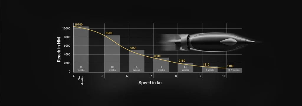 GREYSHARK™ reaches up to 1,100+ nautical miles at 10 knots and an incredible 10,700 NM at 4 knots, enabling mission coverage on a global scale.