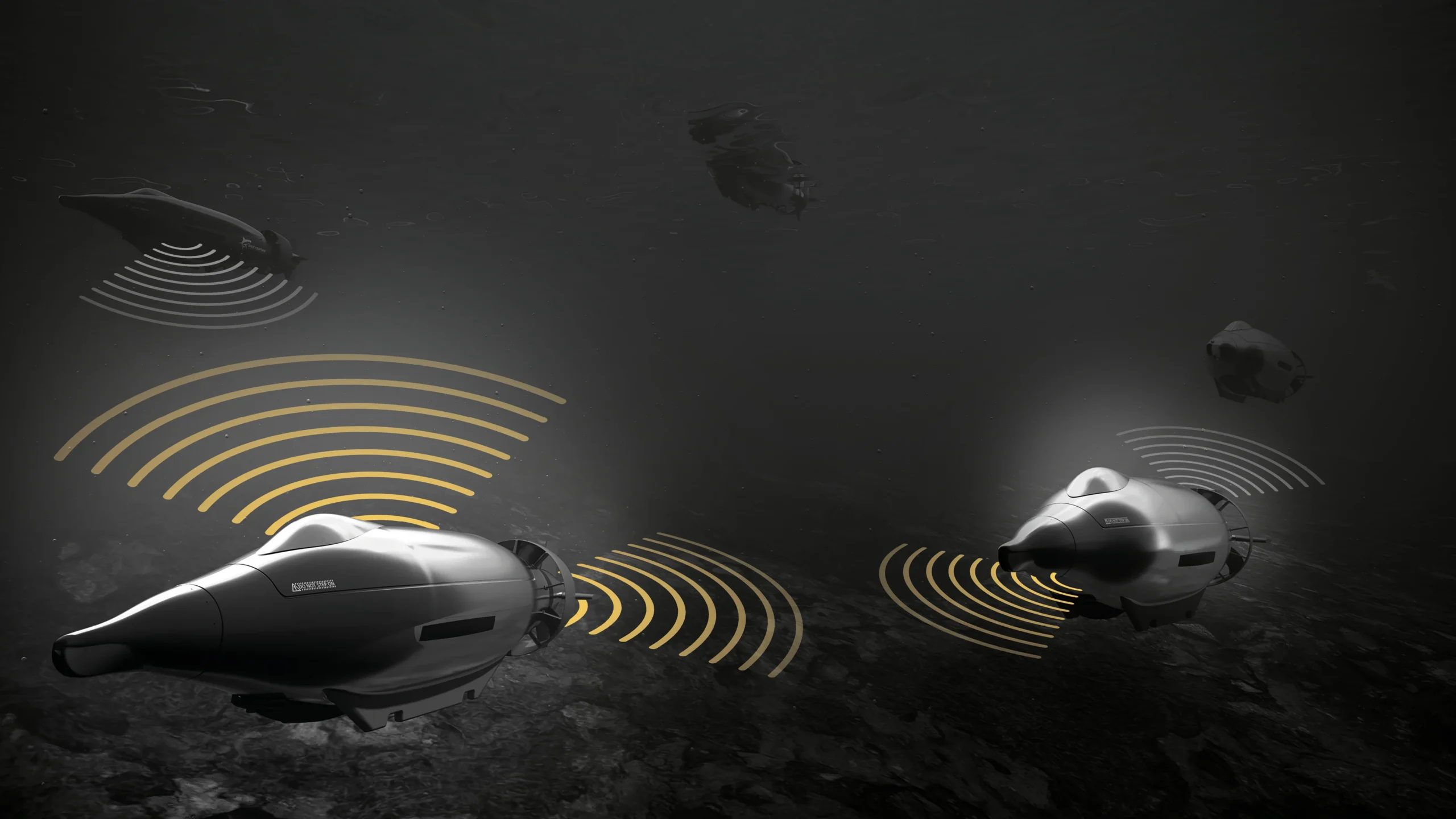 Live-connected swarm capability enables coordinated missions, distributed task execution, and real-time data sharing. Units interact via encrypted underwater acoustic, satellite, and tactical radio communication